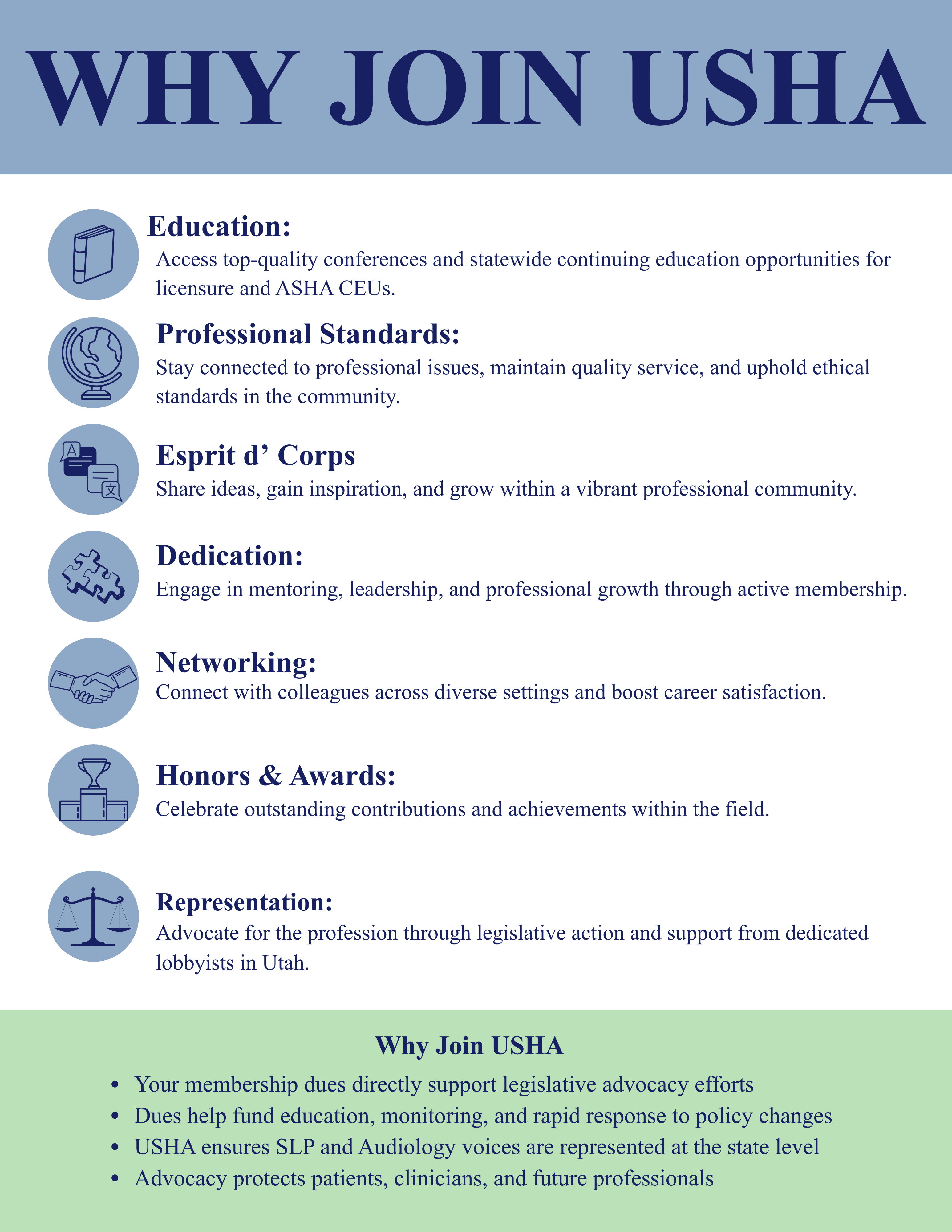 USHA represents speech-language pathologists and audiologists to increase awareness of the profession and provide input regarding current legislative action affecting the field. USHA works with lobbyists who address issues affecting our professions with the State of Utah. Membership dues help support these efforts.